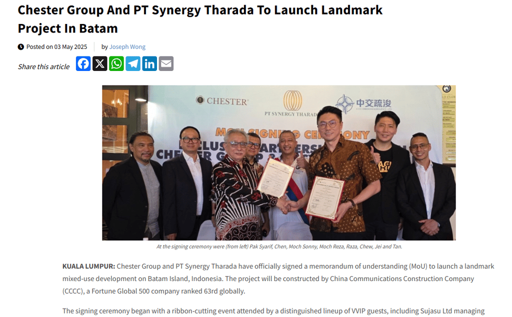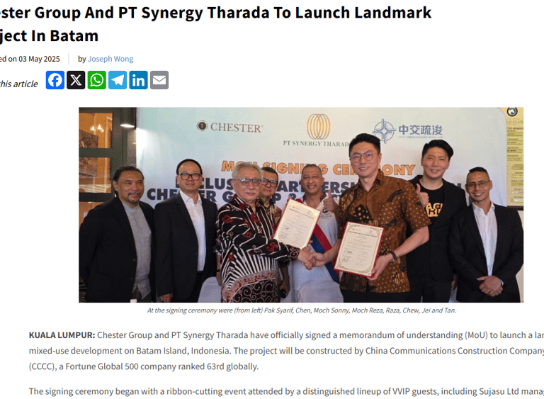 Chester Group and PT Synergy Tharada to launch landmark project in Batam
